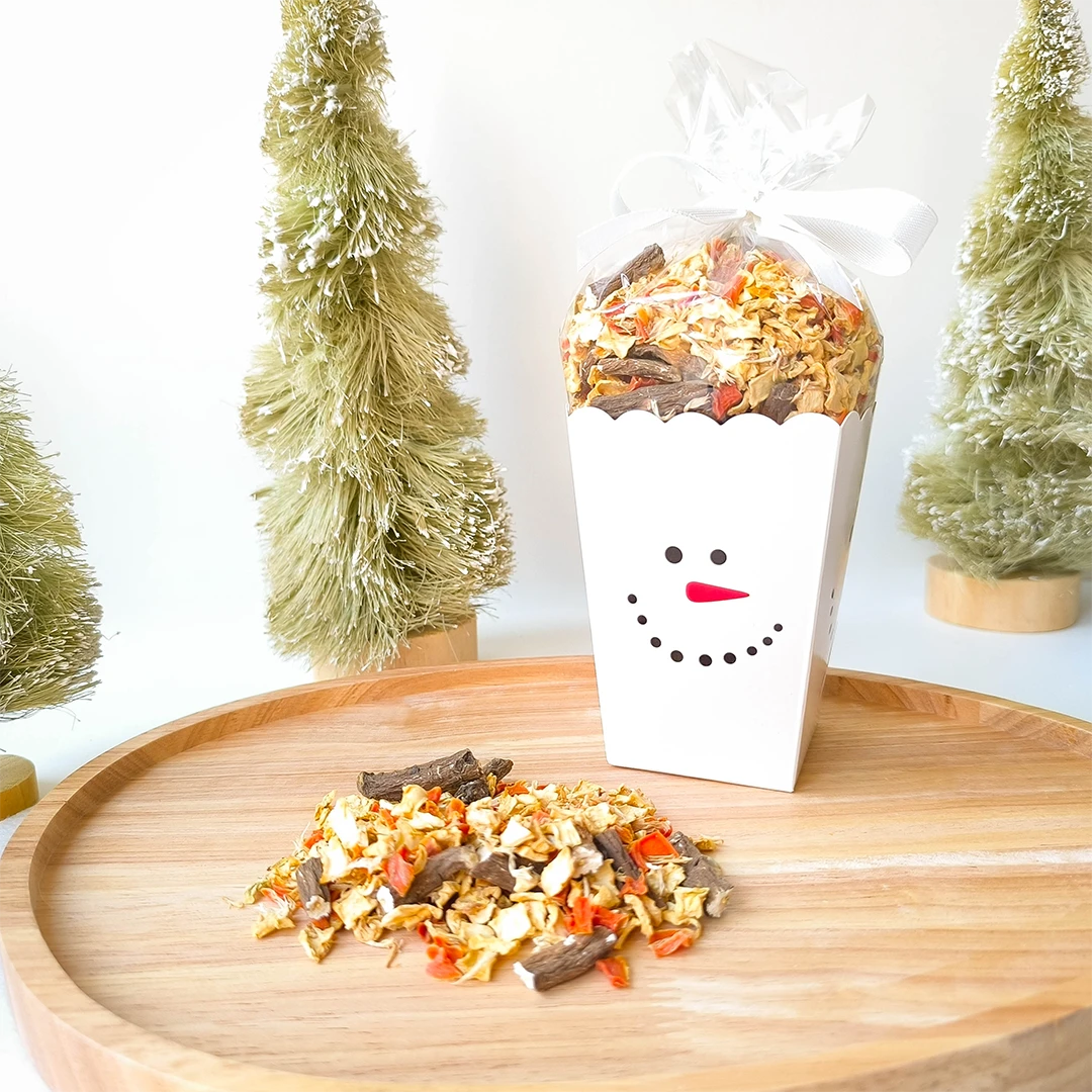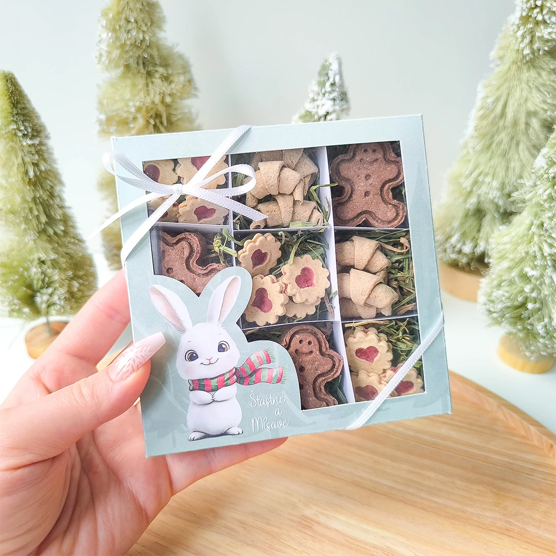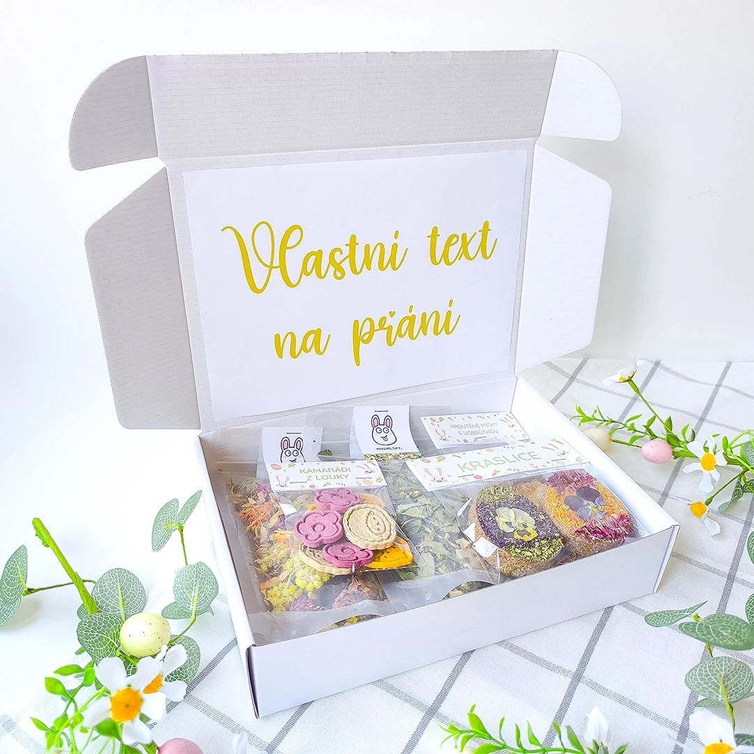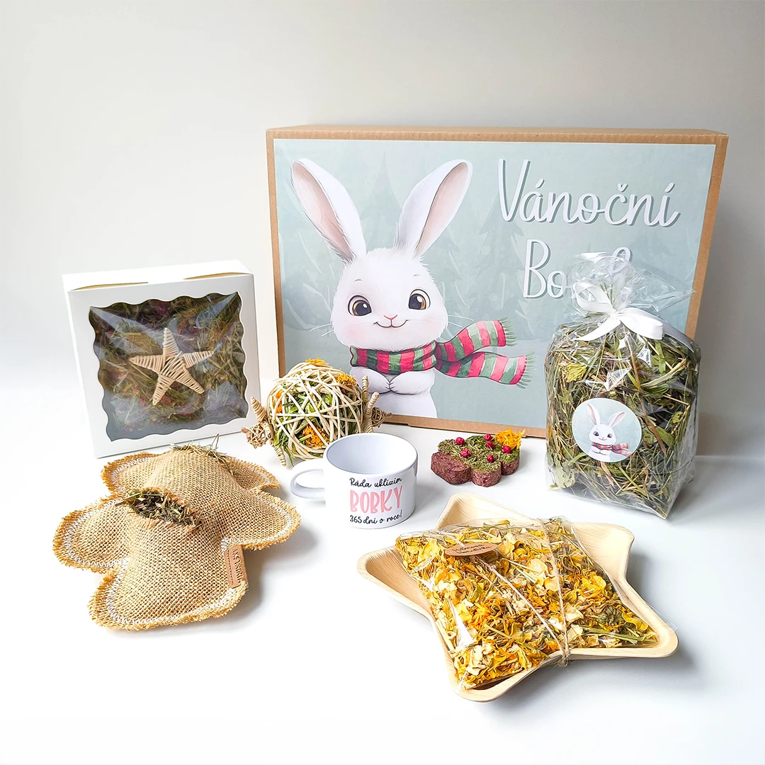 V bezobilném Vánočním boxíku najdeš Senové bločky s jablíčkem, Bojínkovou řezanku, Hvězdičky se slunečnicí, Senový bonbónek, Pralinky v plechové dózičce, Květinové mlsání, Plátky zeleniny a Dřevěné ozdoby.