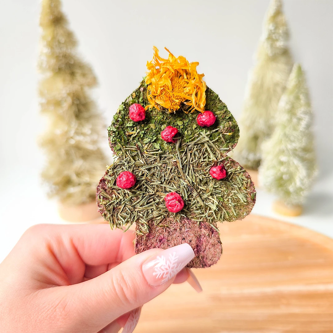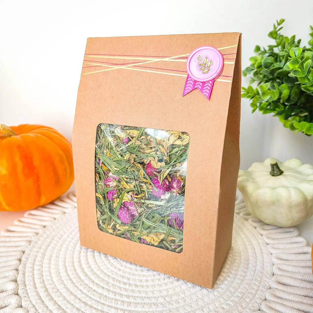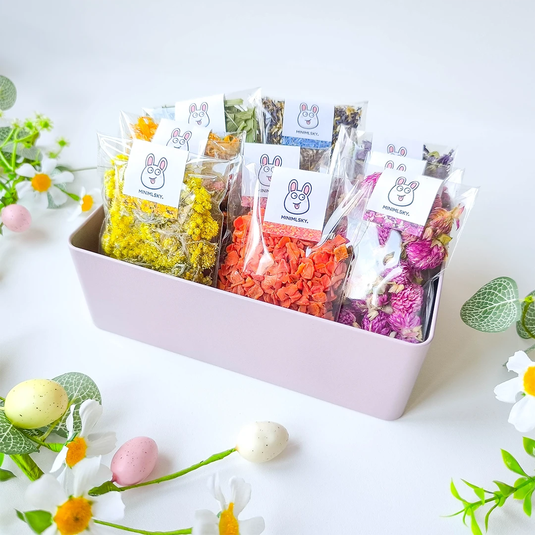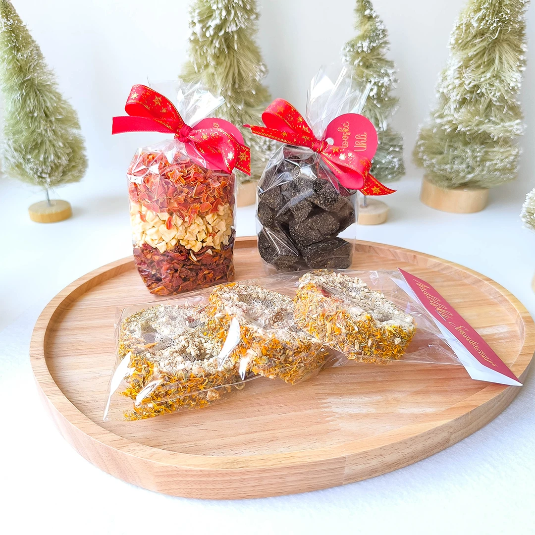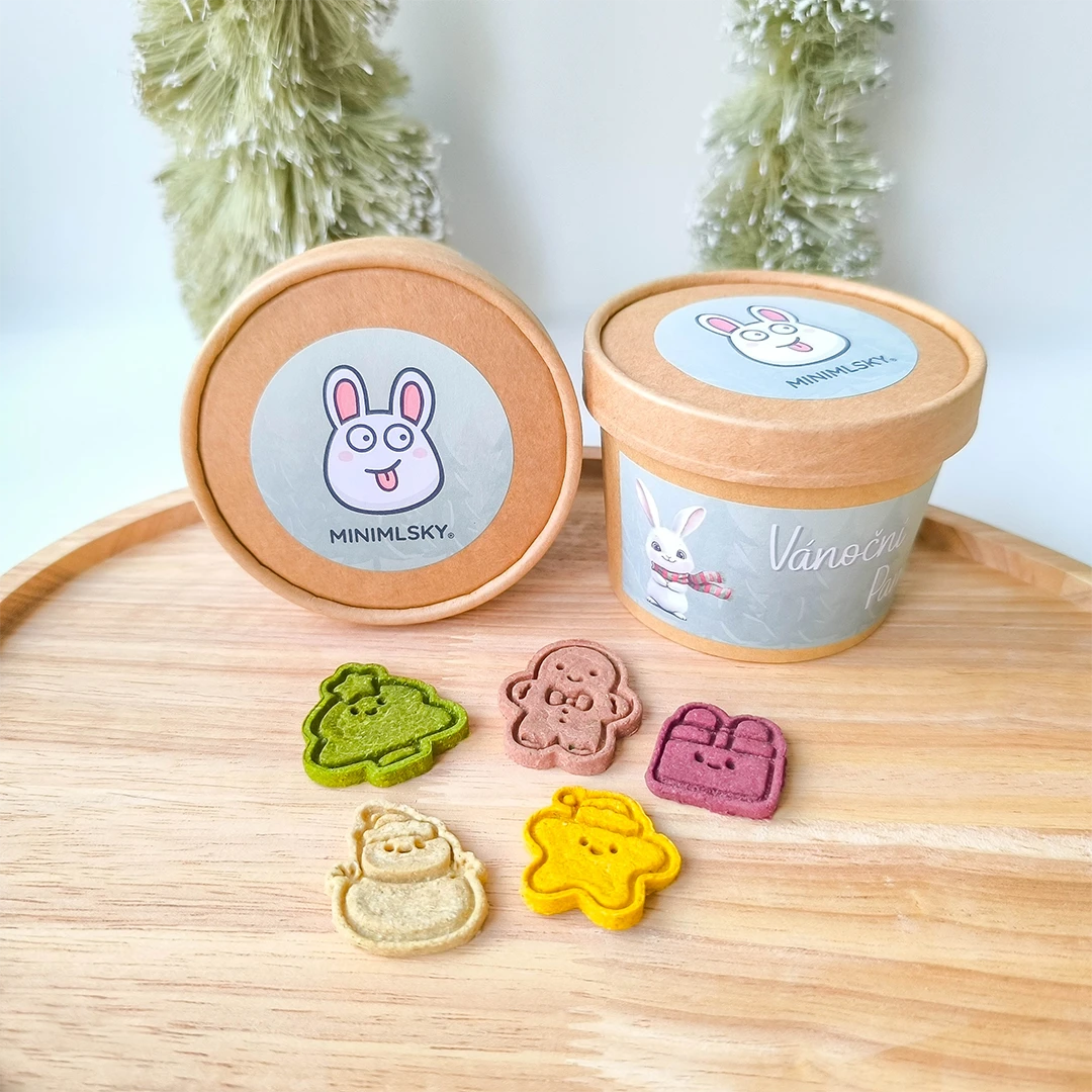 V bezobilném Vánočním boxíku najdeš Senové bločky s jablíčkem, Bojínkovou řezanku, Hvězdičky se slunečnicí, Senový bonbónek, Pralinky v plechové dózičce, Květinové mlsání, Plátky zeleniny a Dřevěné ozdoby.
